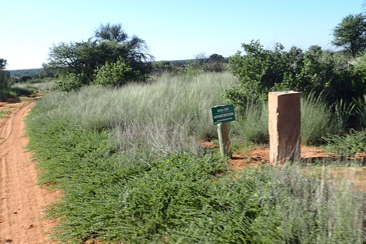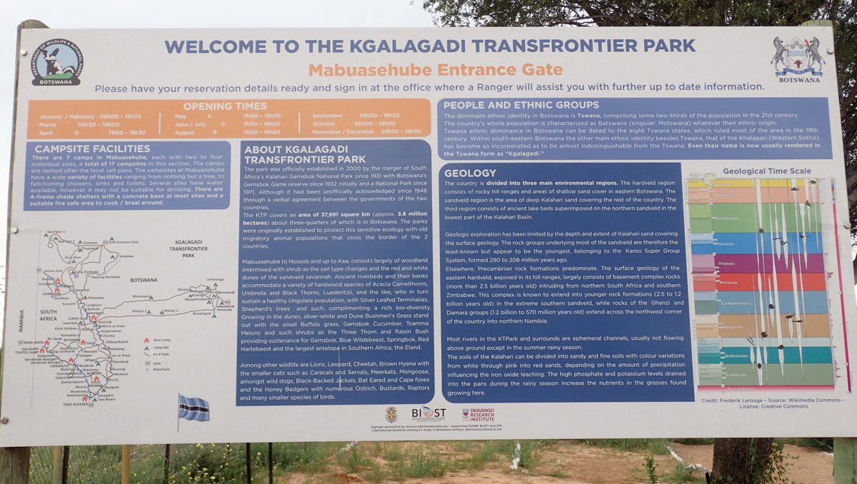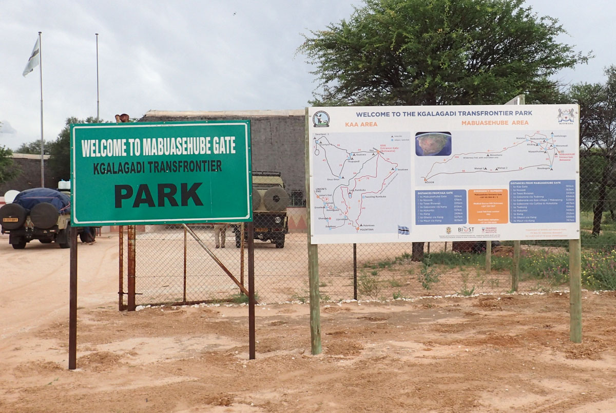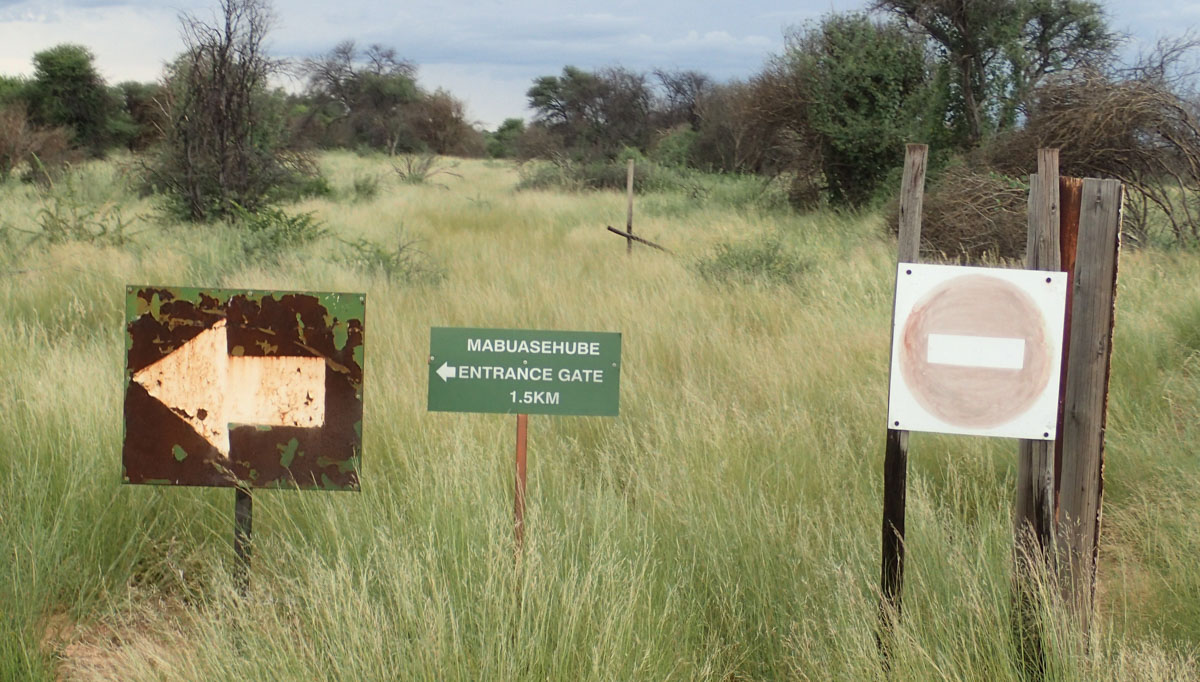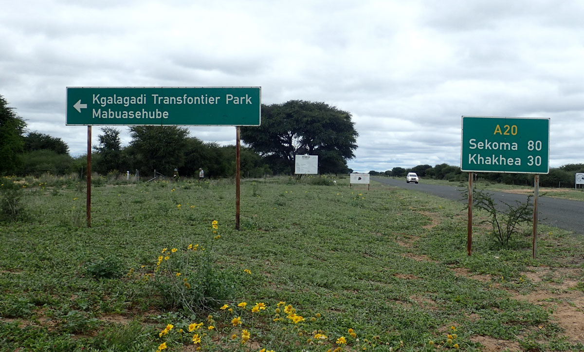 ハボローネからカラハリ・トランスフロンティア公園のボツワナ側マブアシューベ地区のゲートへ直接入園しました。ゲートには新しく公園の説明や紹介の看板が立てられていました。晴れたり曇ったり、時折シャワーがやってくるという天候でした。ゲームドライブ中も周囲の離れた場所ではシャワー。晴れると日差しが強く日焼け止めが必要です。