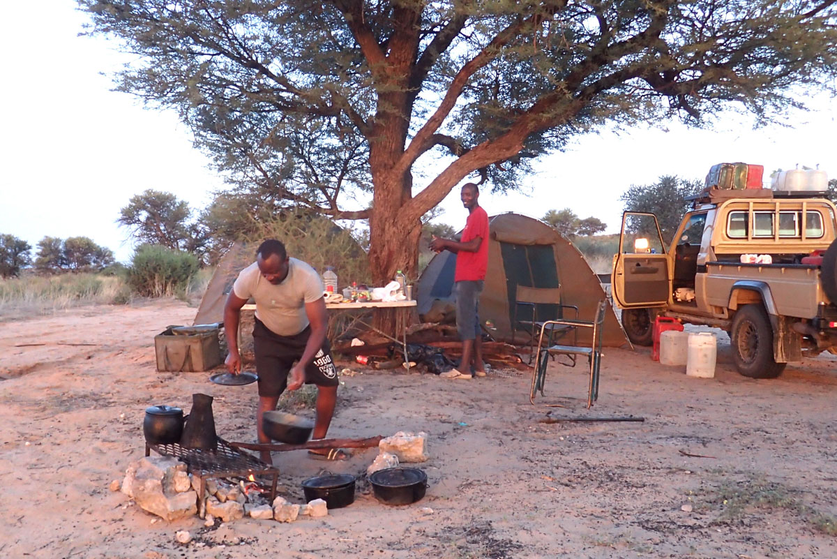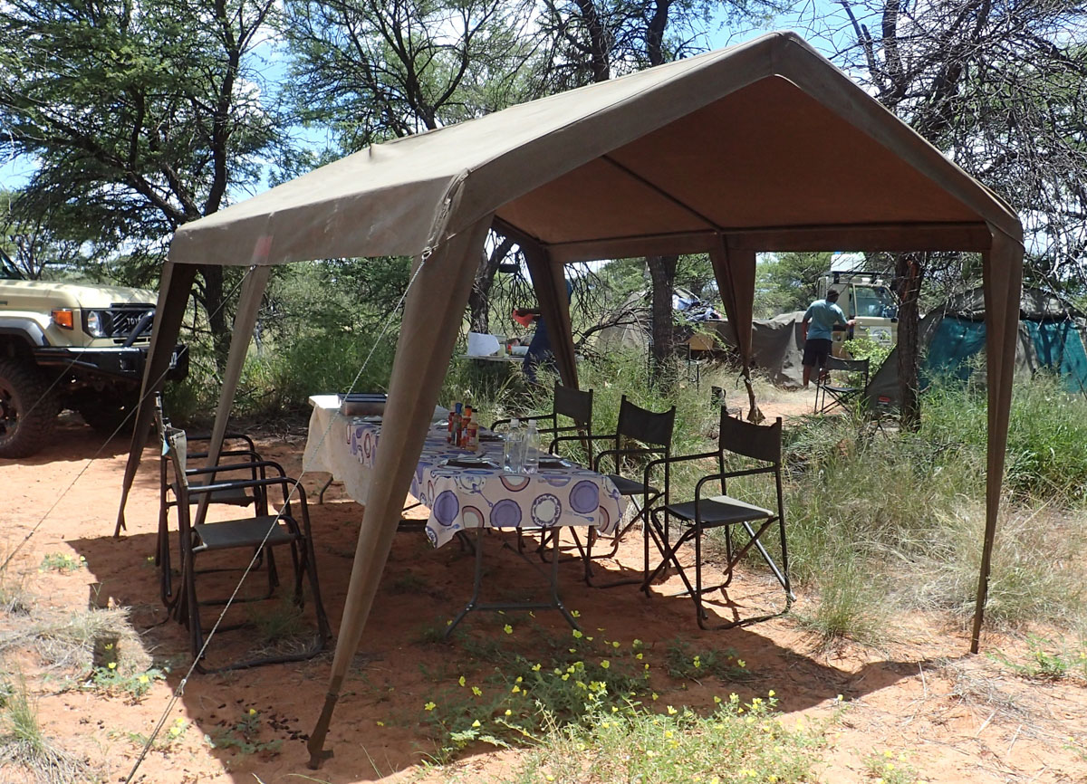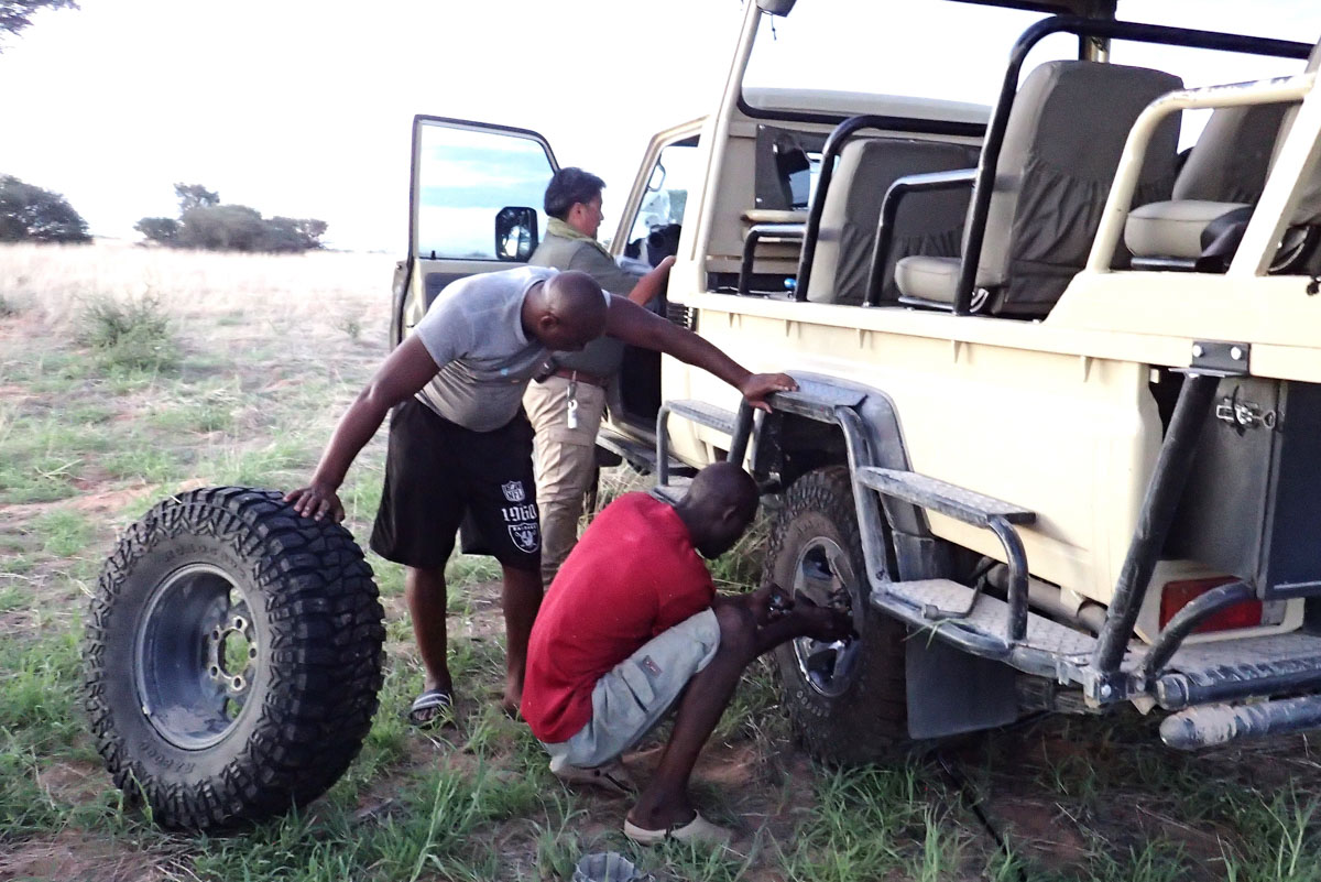 毎夕、ナミビアの方角に稲光が見えました。フライも張ってキャンプ再開です。夜寝るころになると強い風が吹きました。しかし次の夜中にいつもに増してテントを揺るがすような風と雷鳴が聞こえて来たのでサイドのフードのチャックを閉めに起きたのちしばらくして激しい雷雨がやってきました。テントが浮き上がったように感じられたので飛ばされないかと心配しました。ベッドと荷物を端に寄せて重石代わりにしました。次の朝、外に出てみるとL型のタイヤレンチが深々とペグの代わりに打ち込まれていました。コック兼キャンプマスターのティモシーのおかげです。ただ、テントには少し雨水が入っていました。しかし昼間は強い日差しが差し込んできます。