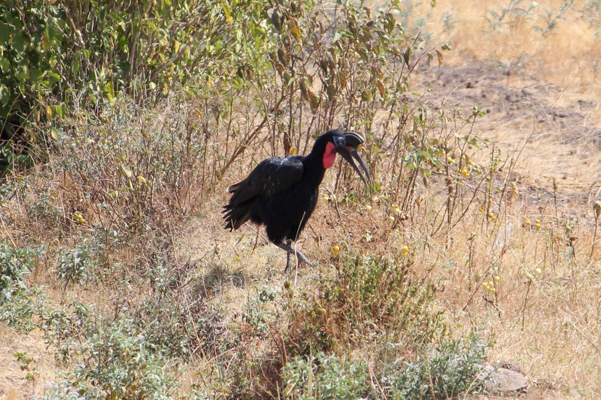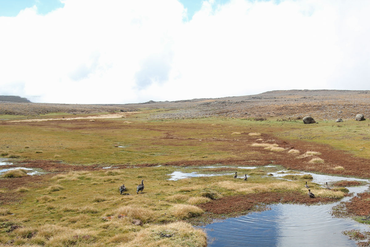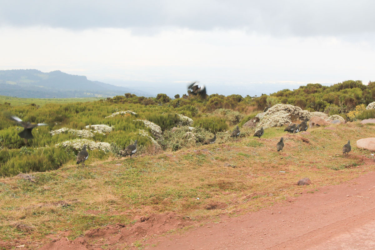 この日は車でバレ・マウンテン国立公園の核心エリアに向かいます。4,000mを超える高原地帯にエチオピア固有種を含めた野生動物・野鳥が暮らしています。最高地点はなんと4,377mで、やはり日中でも気温はかなり低いので、防寒着は必須です。到着すると、早速、大きなジャイアントロベリアが目を引きます。さらに車を走らせると、エチオピア固有種であるアビシニアクイナ、イボトキ、アオバコバシガンを見つけることができました。なお、アビシニアとは現在のエチオピア周辺を指す地域名で、エチオピア固有種には、学名を含め、アビシニアを冠するものが数多くあります。