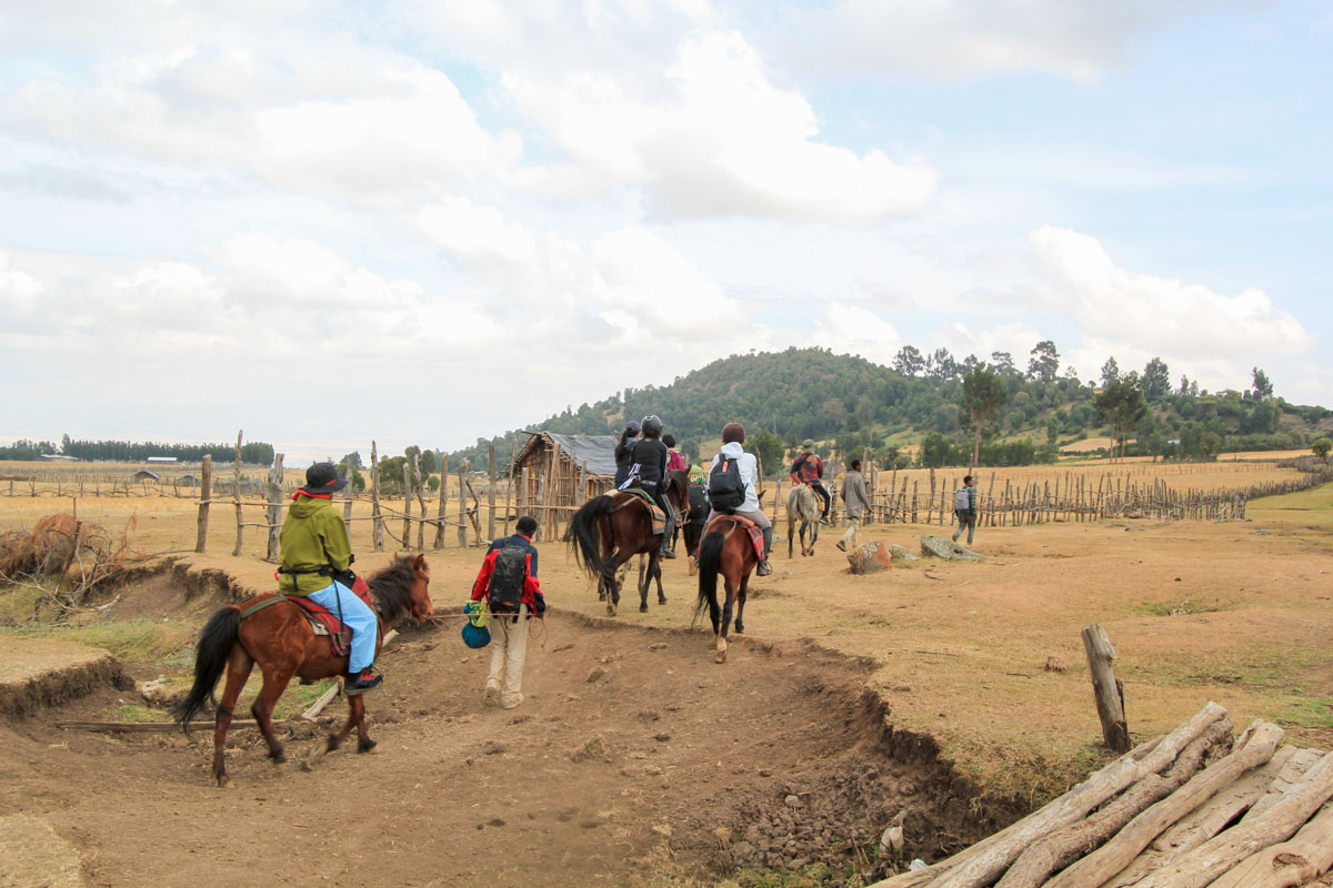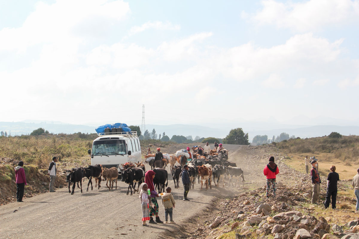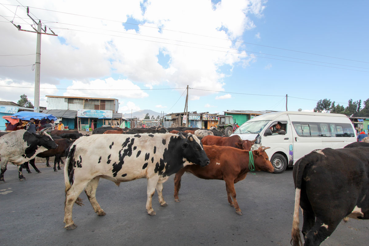 エチオピアの首都、アディスアベバに到着し、早速ホース・トレッキングの出発地となるドドラまで移動します。アディスアベバは渋滞もある大都市ですが、少し離れれば、ゆったりとしたアフリカン・タイムの流れる長閑な風景が広がります。いくつか町を通過しましたが、時には牛の集団に囲まれてしまうことも。アフリカならではのロード・トリップです。