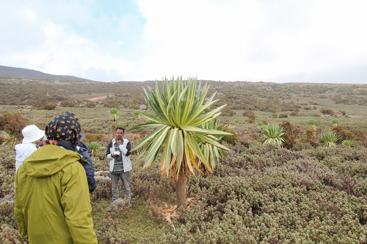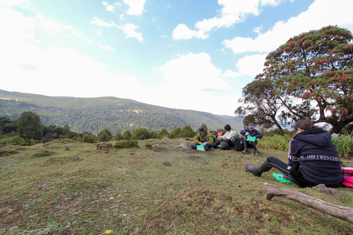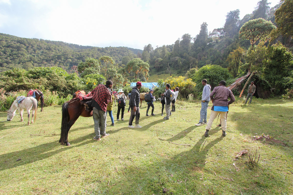 バレの山道を馬にまたがって、少しずつ進んでいきます。道中、綺麗な花をつけたアフリカン・レッドウッド(コソノキ)が数多く見られました。時折、ガイドが現地の文化や自然などを解説してくれます。そして、お昼には、見晴らしの良い所でランチタイム。コックが作ってくれたお弁当をおいしく頂きました。なお、人もそうですが、馬にも休息が必要なので、ところどころに休憩を挟みながら移動していきます。また、場所によっては馬が人を乗せて進めない所もあるので、そういった場合には、お客様にも徒歩で歩いていただきました。午後、標高3,300mもの所にある目的地のキャンプに到着です。やはり朝晩の気温は大分下がり、焚き火にあたって団欒を楽しみました。