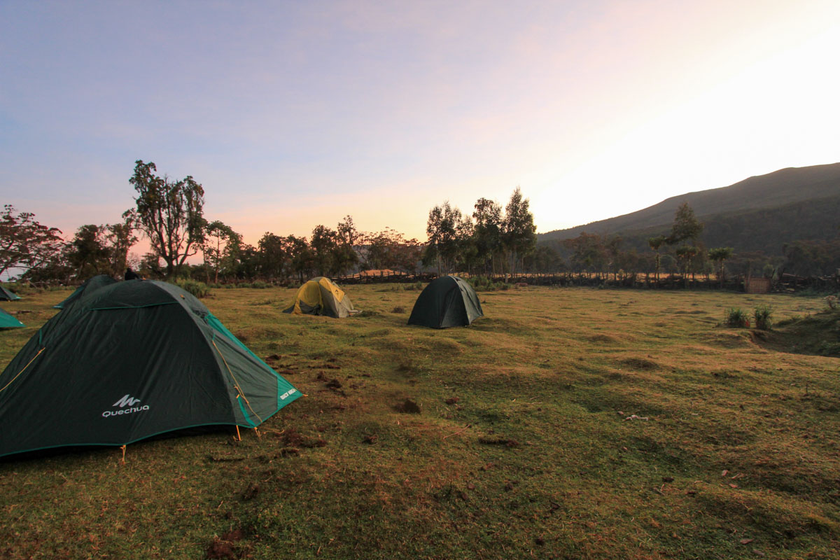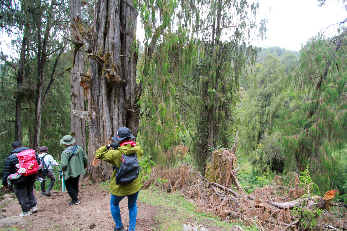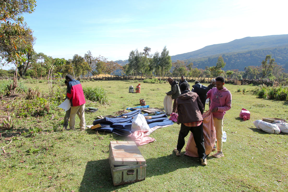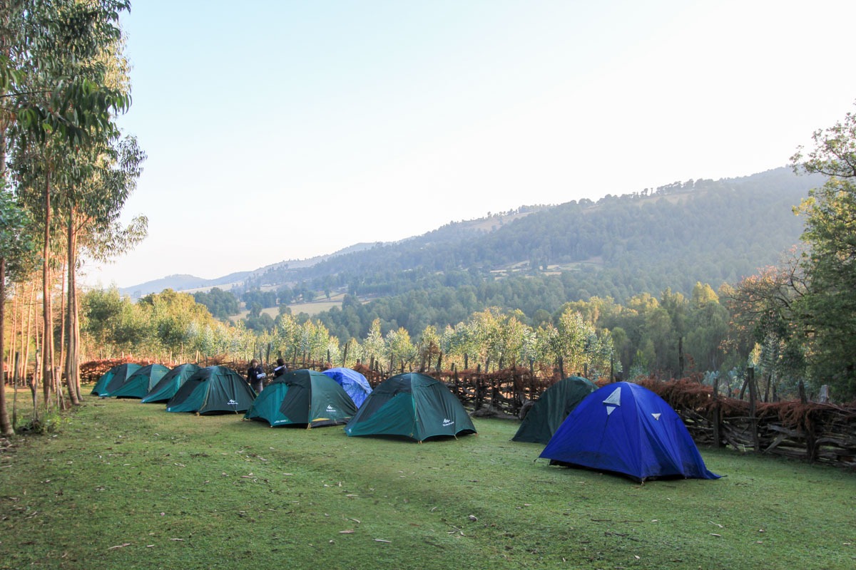 バレの山道を馬にまたがって、少しずつ進んでいきます。道中、綺麗な花をつけたアフリカン・レッドウッド(コソノキ)が数多く見られました。時折、ガイドが現地の文化や自然などを解説してくれます。そして、お昼には、見晴らしの良い所でランチタイム。コックが作ってくれたお弁当をおいしく頂きました。なお、人もそうですが、馬にも休息が必要なので、ところどころに休憩を挟みながら移動していきます。また、場所によっては馬が人を乗せて進めない所もあるので、そういった場合には、お客様にも徒歩で歩いていただきました。午後、標高3,300mもの所にある目的地のキャンプに到着です。やはり朝晩の気温は大分下がり、焚き火にあたって団欒を楽しみました。