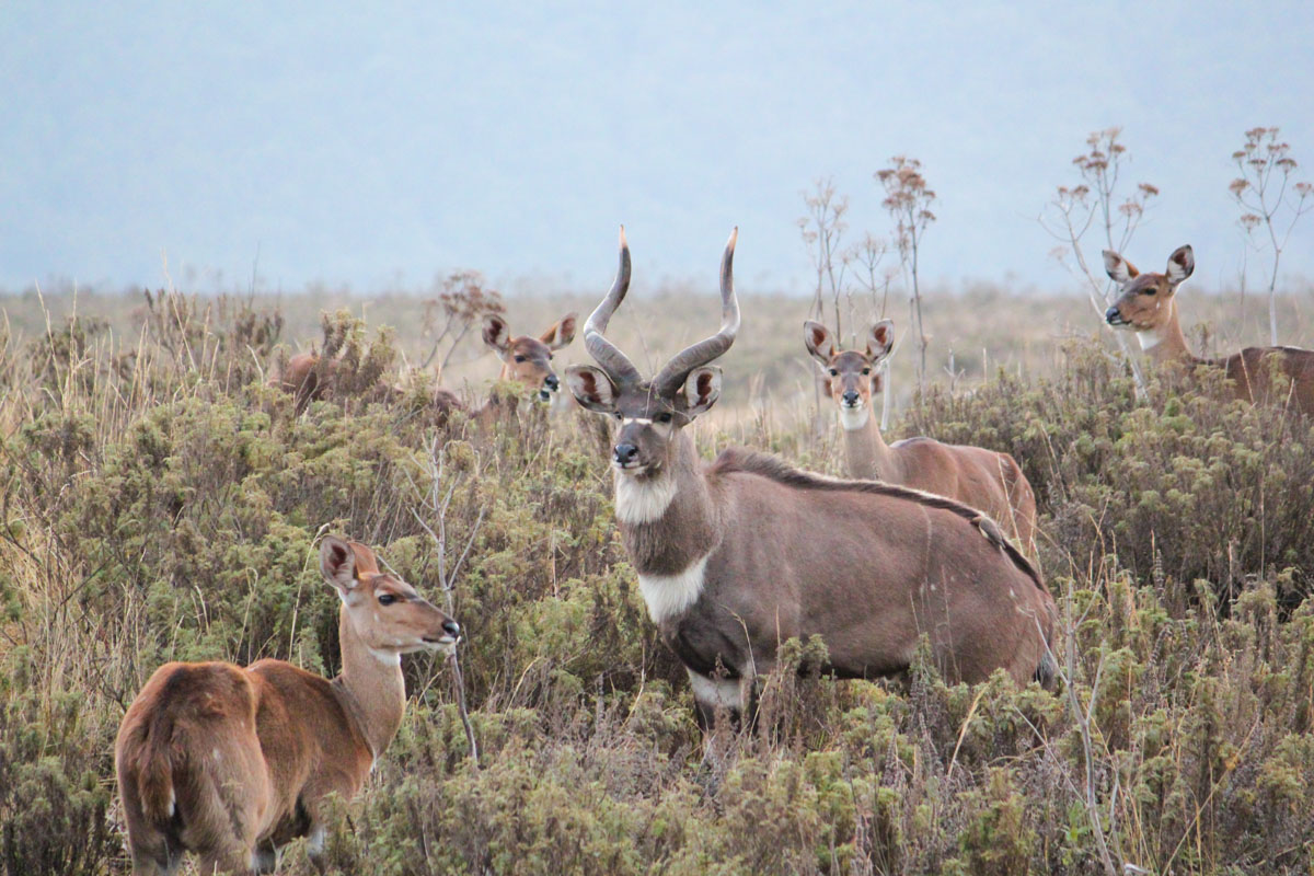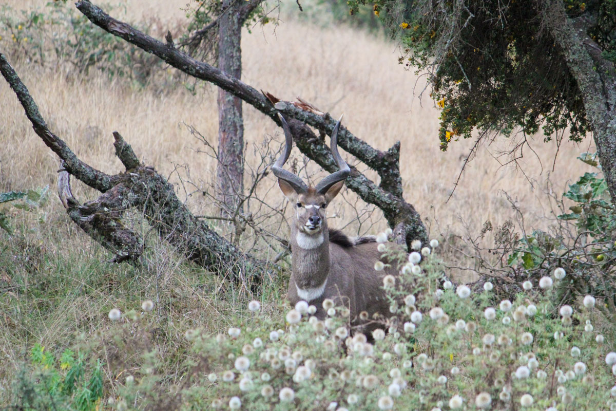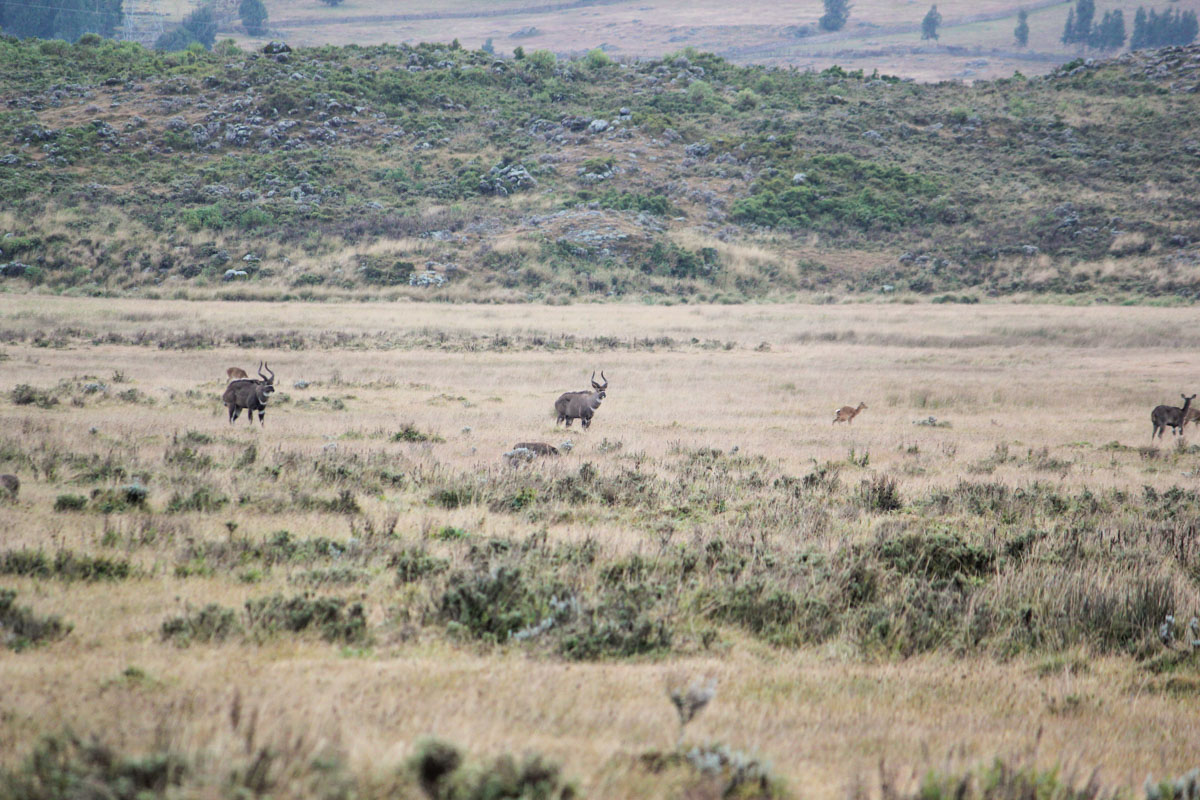 午後はバレ・マウンテン国立公園のメイン・エントランスであるディンショにやってきました。お目当ては何と言っても、エチオピアの固有種である大型のアンテロープ、マウンテン・ニャラ。一時はかなり数を減らしてしまいましたが、保護活動が功を奏し、近年順調に個体数を回復させている様です。この日も、最初はイボイノシシやリードバック等と共に、遠目に見られただけでしたが、根気よく探していると、かなりの至近距離で遭遇することもできました。外に向かってねじれた大きな角が美しく、本当に立派です。