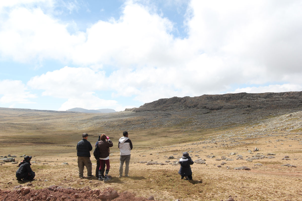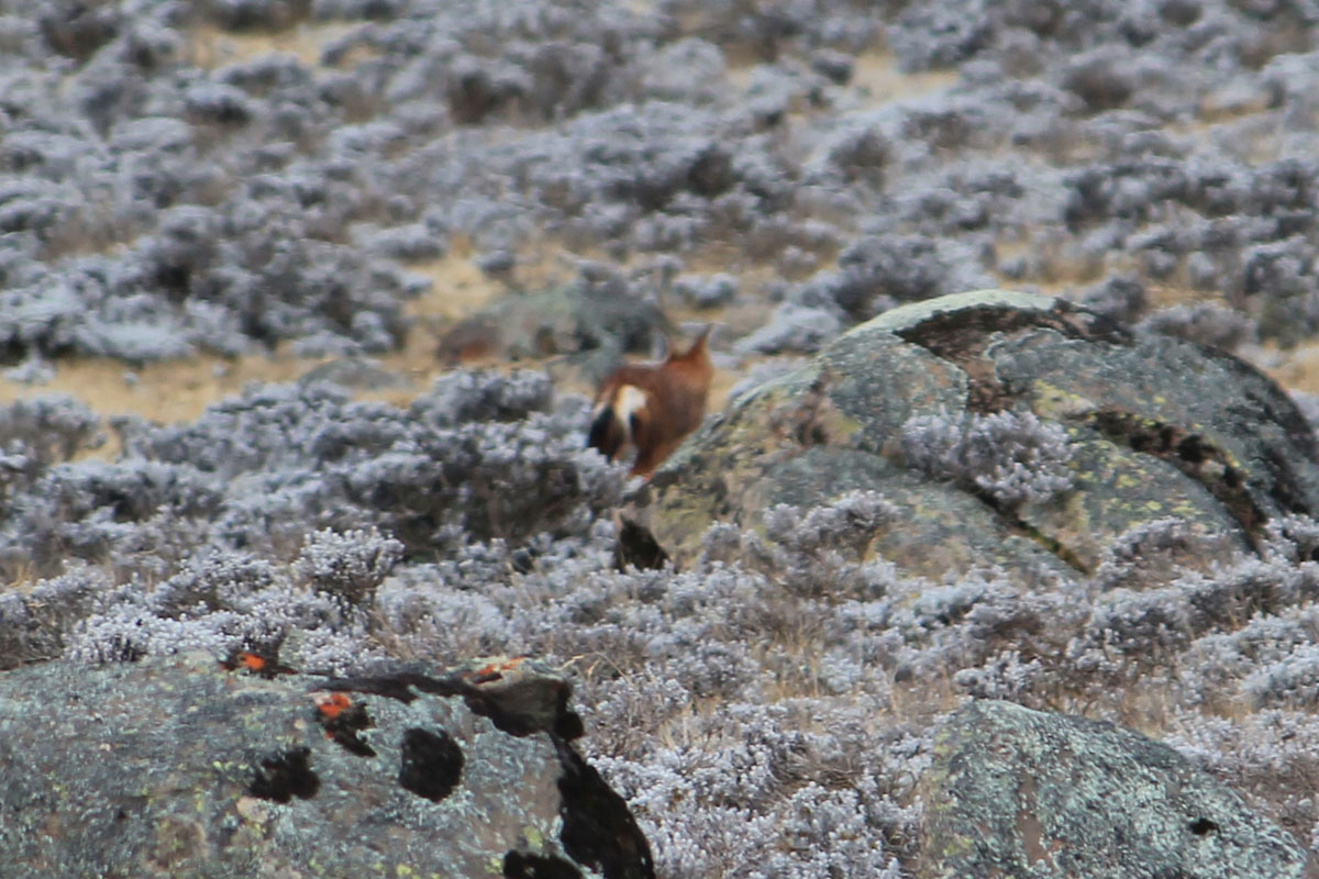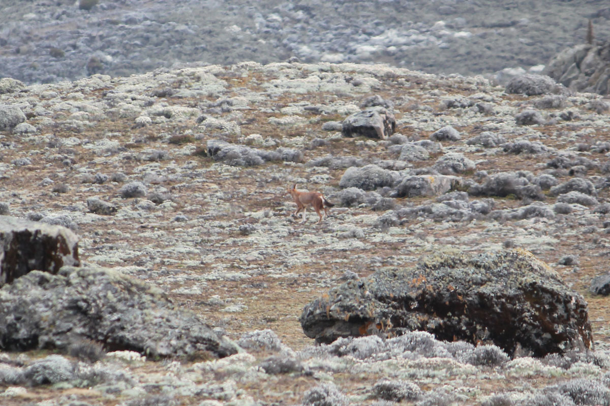 ここでの主役はやはり、「アフリカ最後のオオカミ」と言われるエチオピアン・ウルフでしょう。しかし、そう簡単には登場してくれません。ガイドやドライバーのみならず、旅行者の皆さんも車内から目を光らせます。すると、ガイドが「いた!」という一声。そちらに目を向けると、走り去るオオカミの姿が…。残念ながら、初回は後ろ姿を捉えたのみでした。しかし、以降も何度か遭遇のチャンスがあり、この日は3回、計4頭のエチオピアン・ウルフを見ることができました。