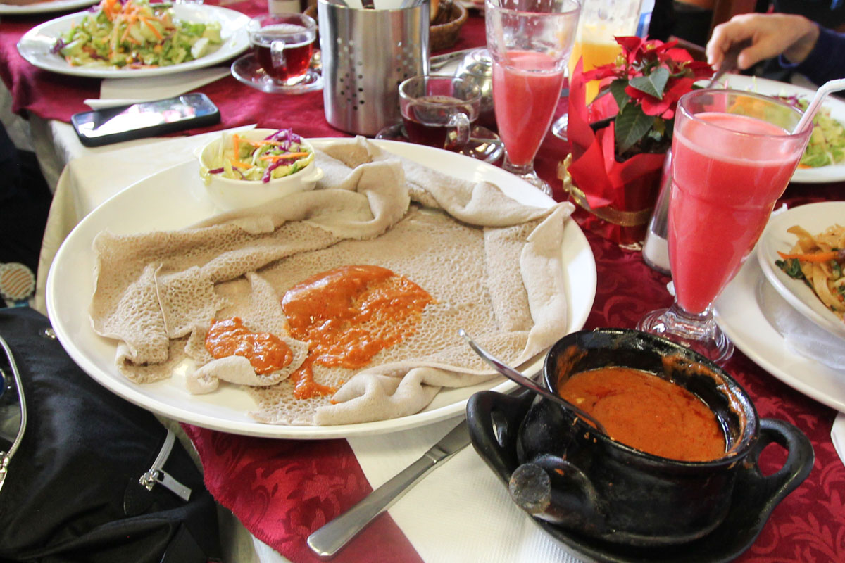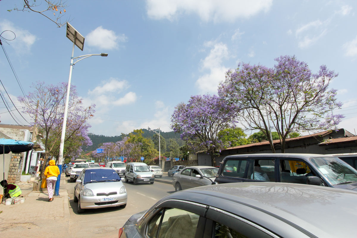 ロッジで朝食後、ランガノ湖を出発です。朝食のレストランでは、ロッジのスタッフがコーヒーセレモニーでコーヒーを振る舞ってくれました。その後、アディスアベバに向かいます。5日ぶりのアディアベバの街は新鮮で、ジャカランダの花が綺麗に咲いていました。レストランでは昼食にエチオピア料理を楽しみ、午後は市内観光に向かいます。