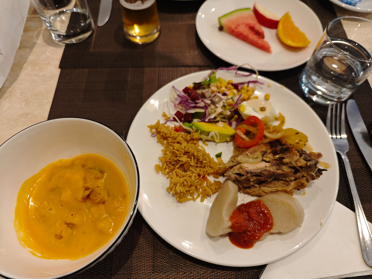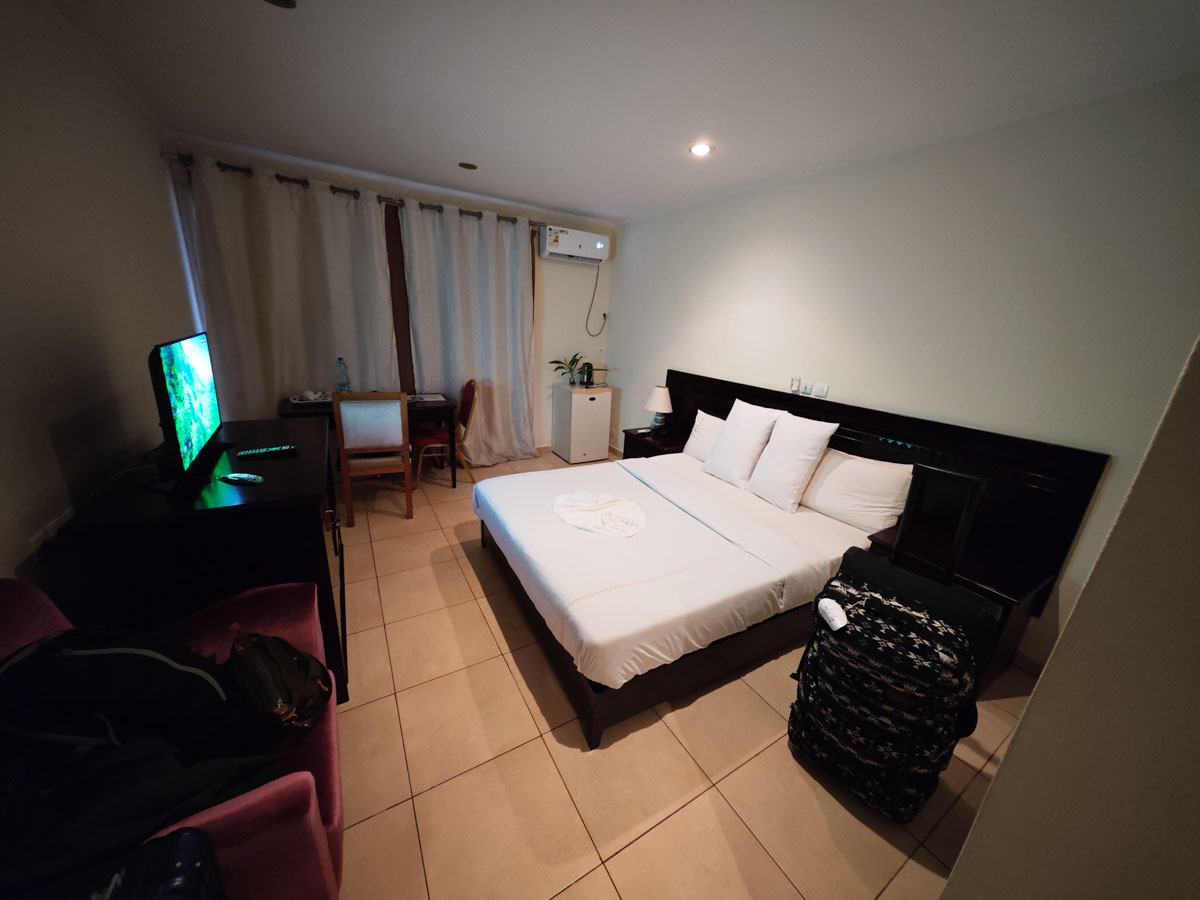 リーブルビルのホテルはアメリカ大使館がすぐそこにある場所にあり、安全が確保されている感じがしました。部屋はツインですが2人で使うにはちょっと狭く感じました。全体の雰囲気は良いのですが、よくある話ですが、メンテナンスが行き届いていないため、残念なところもありました(廊下の床面が浮き上がっており、折角色を変えたりしているのにもったいない感じがしました)。食事はビュッフェでしたが、基本食べやすく、良かったと思います。