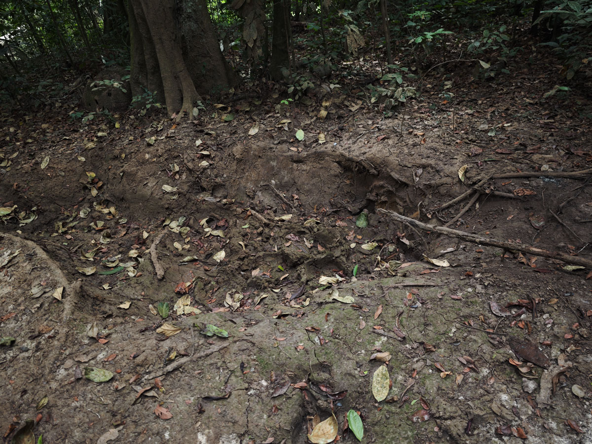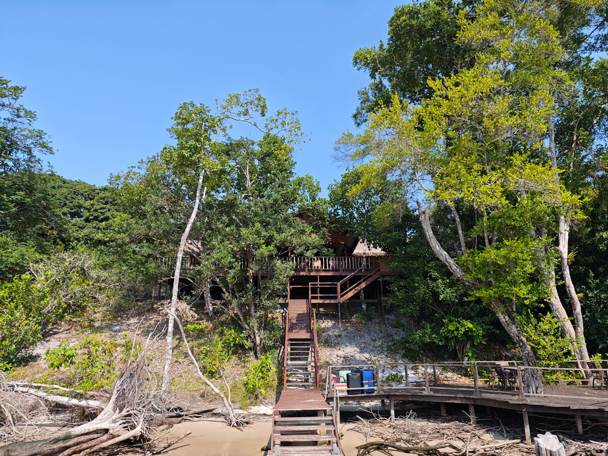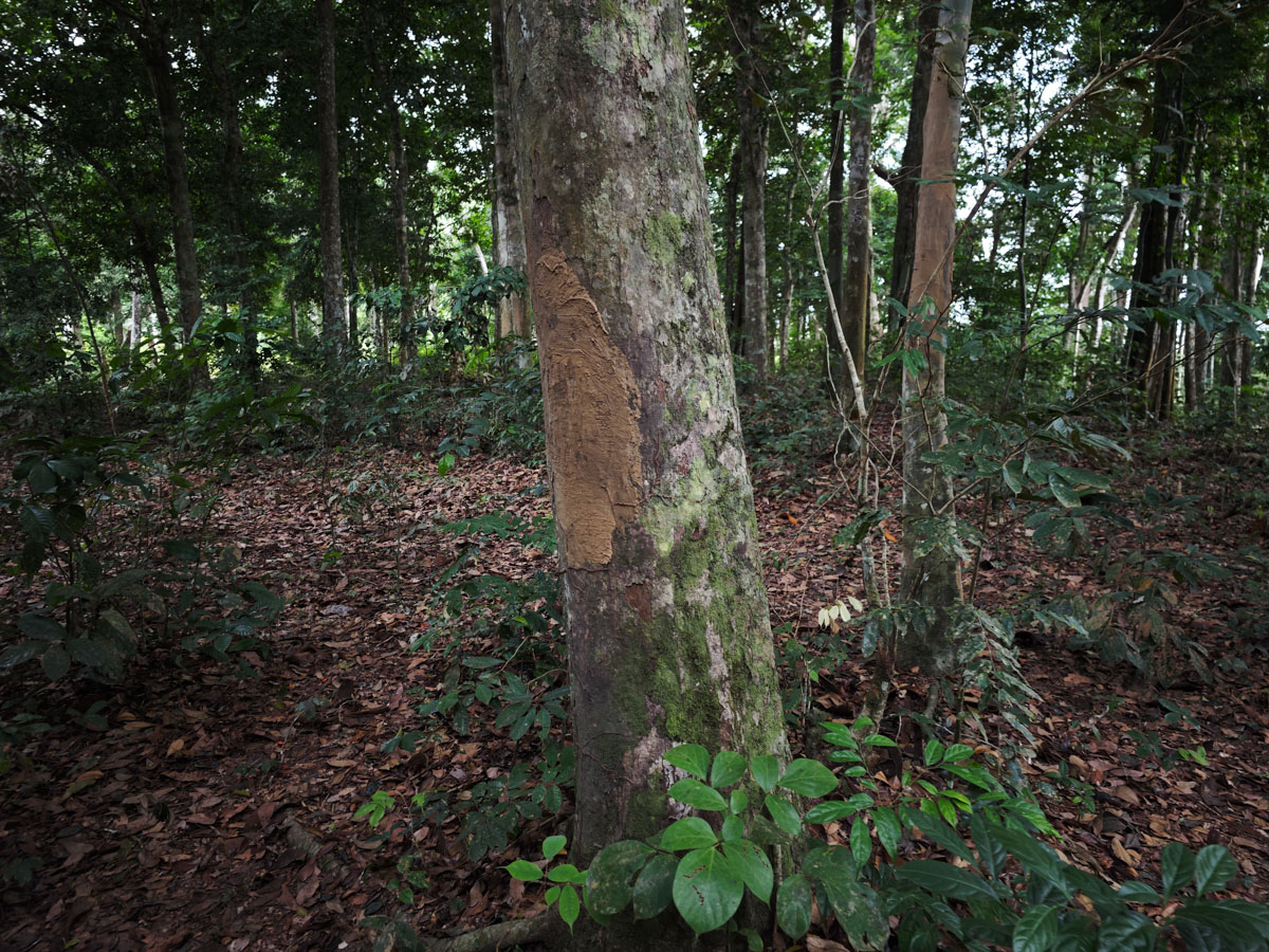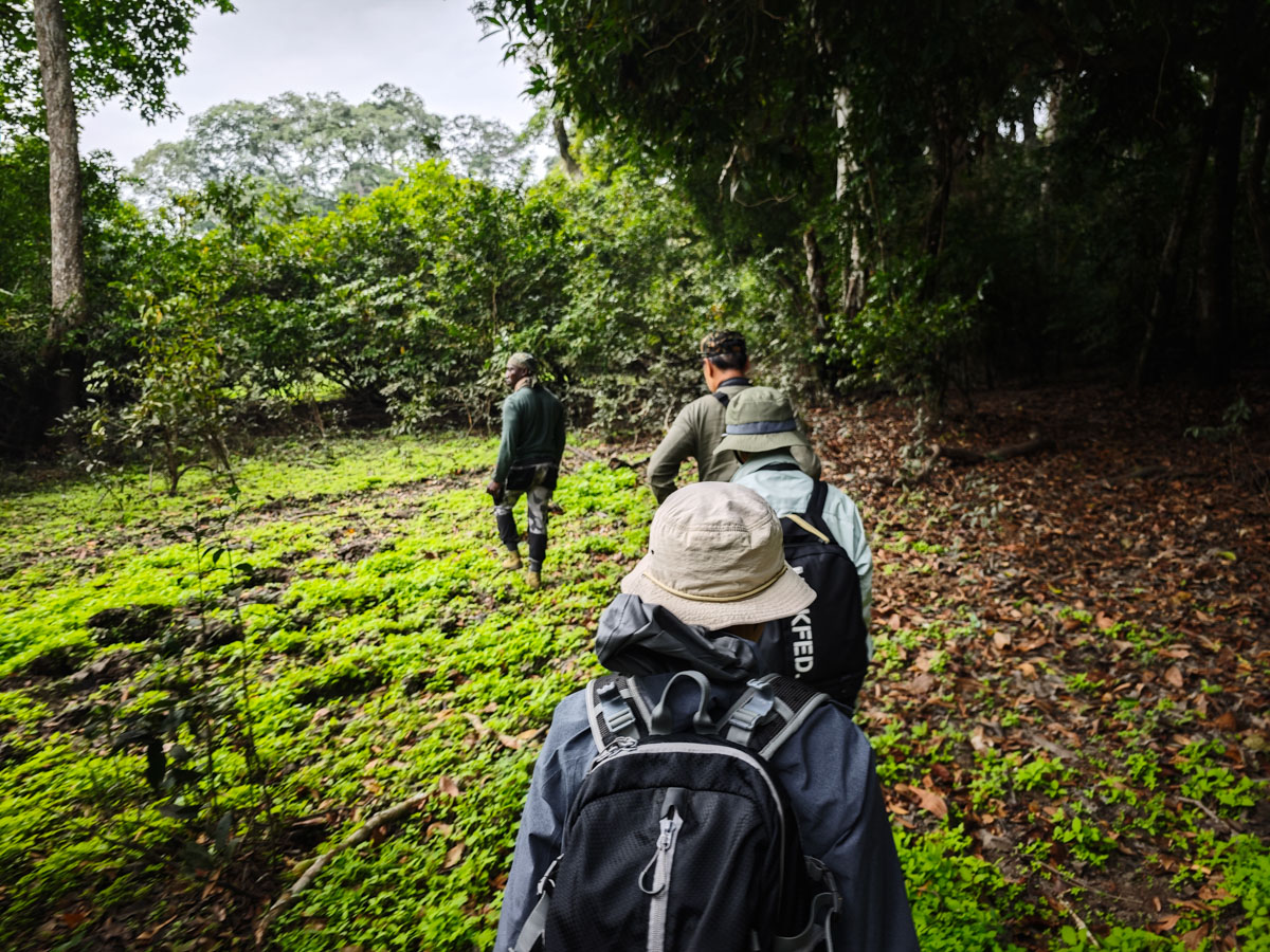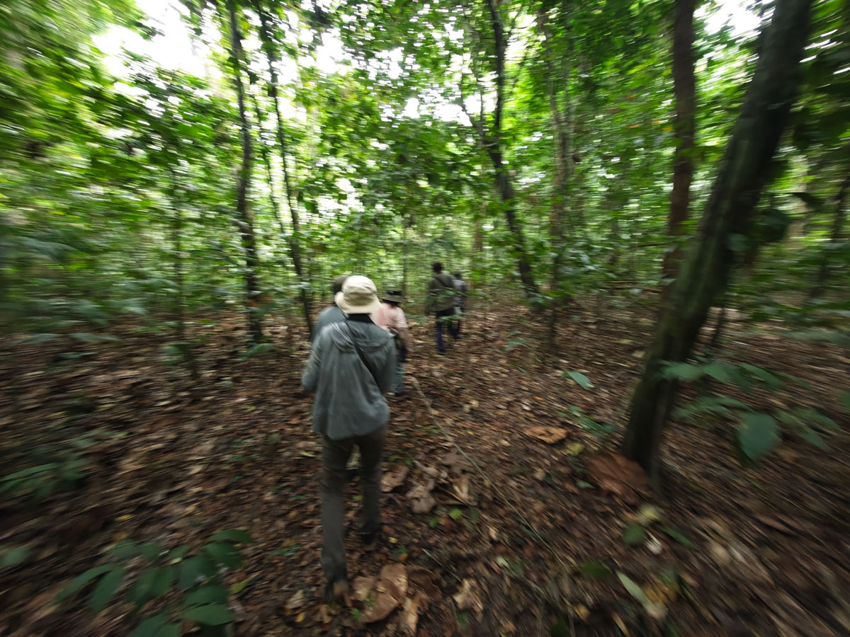 ウォーキングサファリでは、たくさんの動物の気配を感じることができました。サルたちが木の枝を伝っている音と姿、イノシシが群れで動く影、マルミミゾウの痕跡、飛び立つ鳥。熱帯雨林の中、時には泥濘に足を取られながら、動物たちを探して歩くだけでも気持ちの良いものでした。ボートに戻って一休み、ドリンクサービスがあり、のどを潤してからロッヂに戻りました。