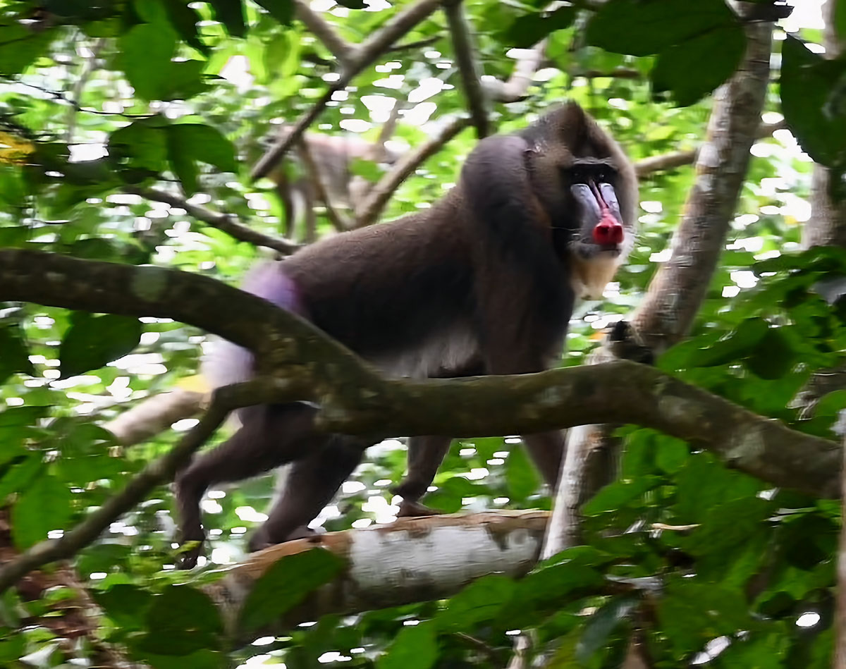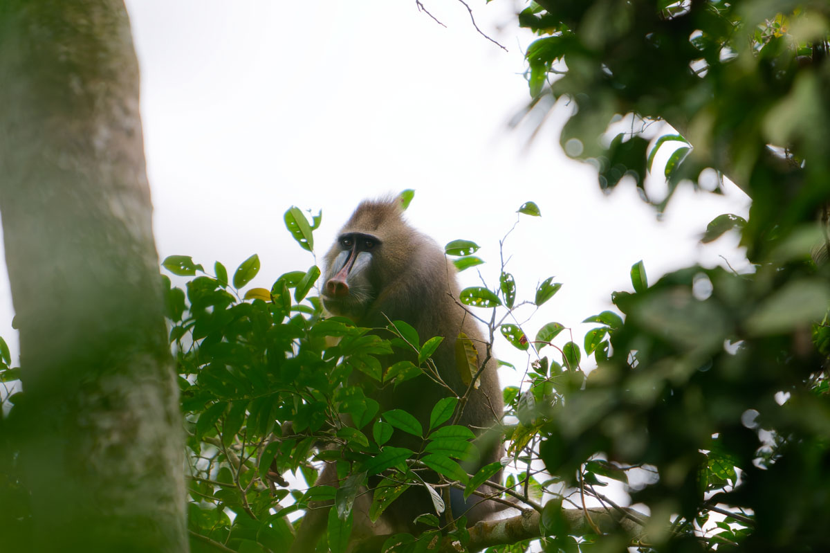 私たちのグループのトラッキングについて紹介します。まずは車で小高い丘まで移動し、アンテナで電波を探します。電波発信機とGPSの両方を使っているようでした。その後、熱帯雨林の帯まで車で近づき、またアンテナを立てて方向を確認していました。ただ、熱帯雨林を目の前にすると、すでに森に吠える声が響いてきて、期待が高まってきました。ガイドを先頭に熱帯雨林に入りました。吠え声が大きくなってきました。がさがさという音も聞こえます。ガイドが指さす方向に、マンドリルが飛んでいます。ゴリラトラッキングよりも早く、かつ平地で楽にマンドリルを見つけることができました。ただ、木々が生い茂り、そのためちょっと暗いため、またそれなりに距離があるため、なかなかはっきりとマンドリルを捕捉するのは難しかったです。それでも望遠レンズや双眼鏡で観察できました。ただ、ボス格のオスはなかなか前に出てこないため、より観察が難しかったと思います。実際に遭遇する前は、以前にテレビで見たロペの野生のマンドリルの様子が全てでした。ボス格のオスを中心に地面を走っていく姿がそれです。しかし、実際に見たマンドリルの群れは、高い木の上を枝伝いに動きまわっており、過去に熱帯雨林で見てきたサルたちと変わらない生態だと感じました。また、地面にも降りてきて動いている姿も見られました。特に、ボス格のオスは茂みの奥の地面近くにいました。だから余計に撮影は難しかったです。
