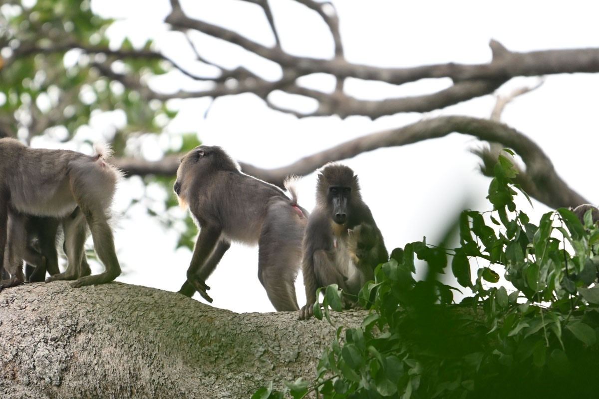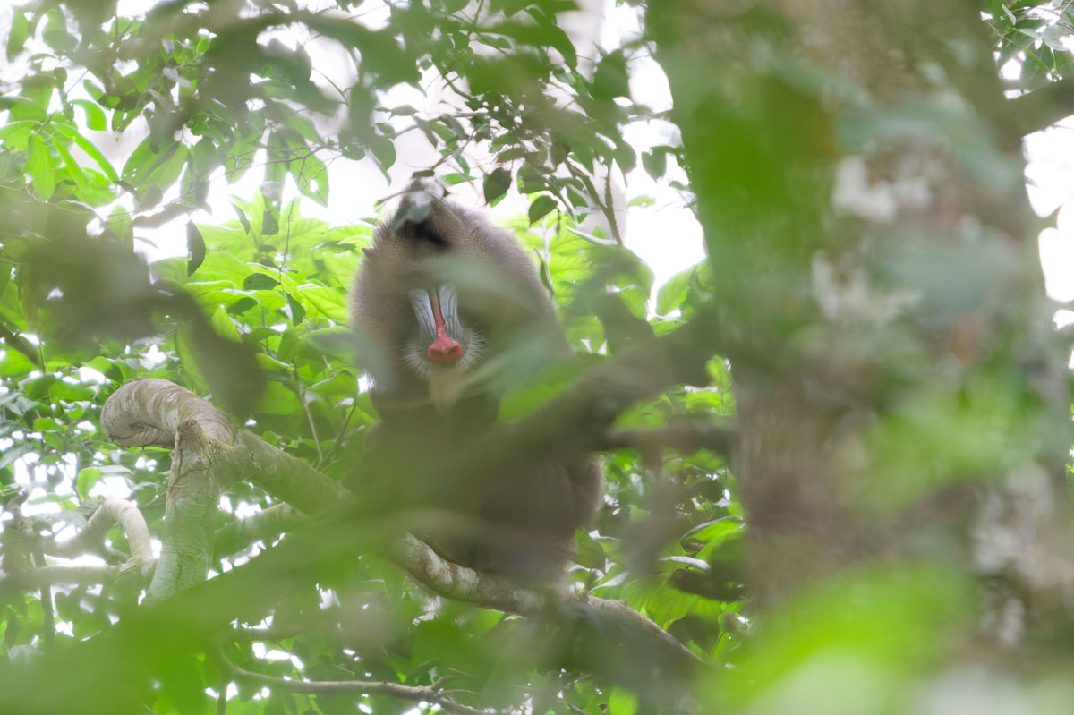 1時間程度少しずつ動きながら観察できました。親子のマンドリル、まだ成熟途中のオス、メスも、結構な規模の群れを観察しました。今回、パートナーが動画を撮りました。動画も相当苦戦していましたが、動いているマンドリルを何とか捉えることができていました。