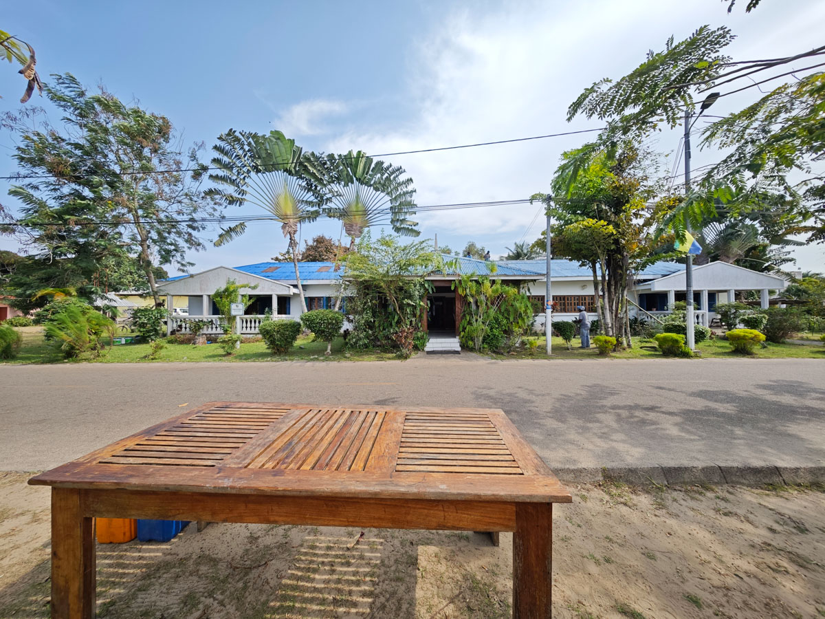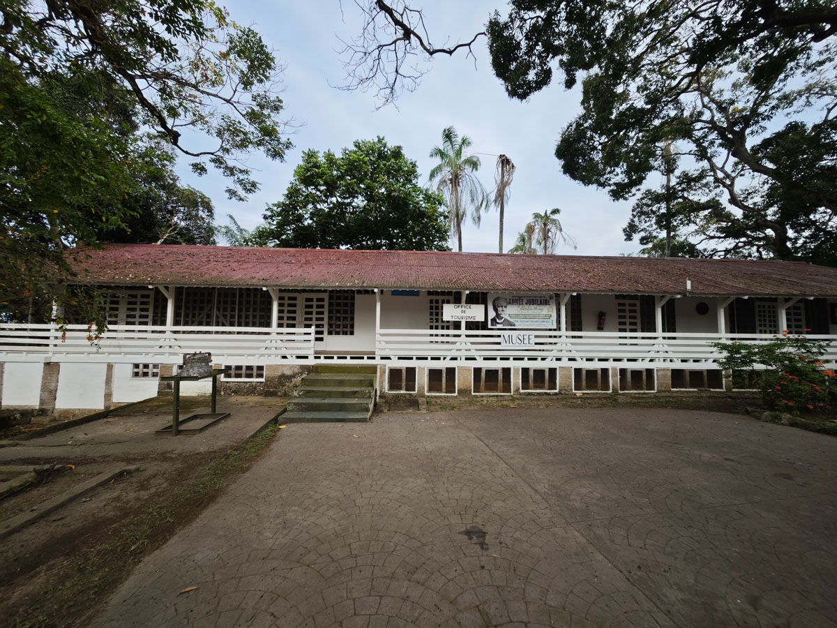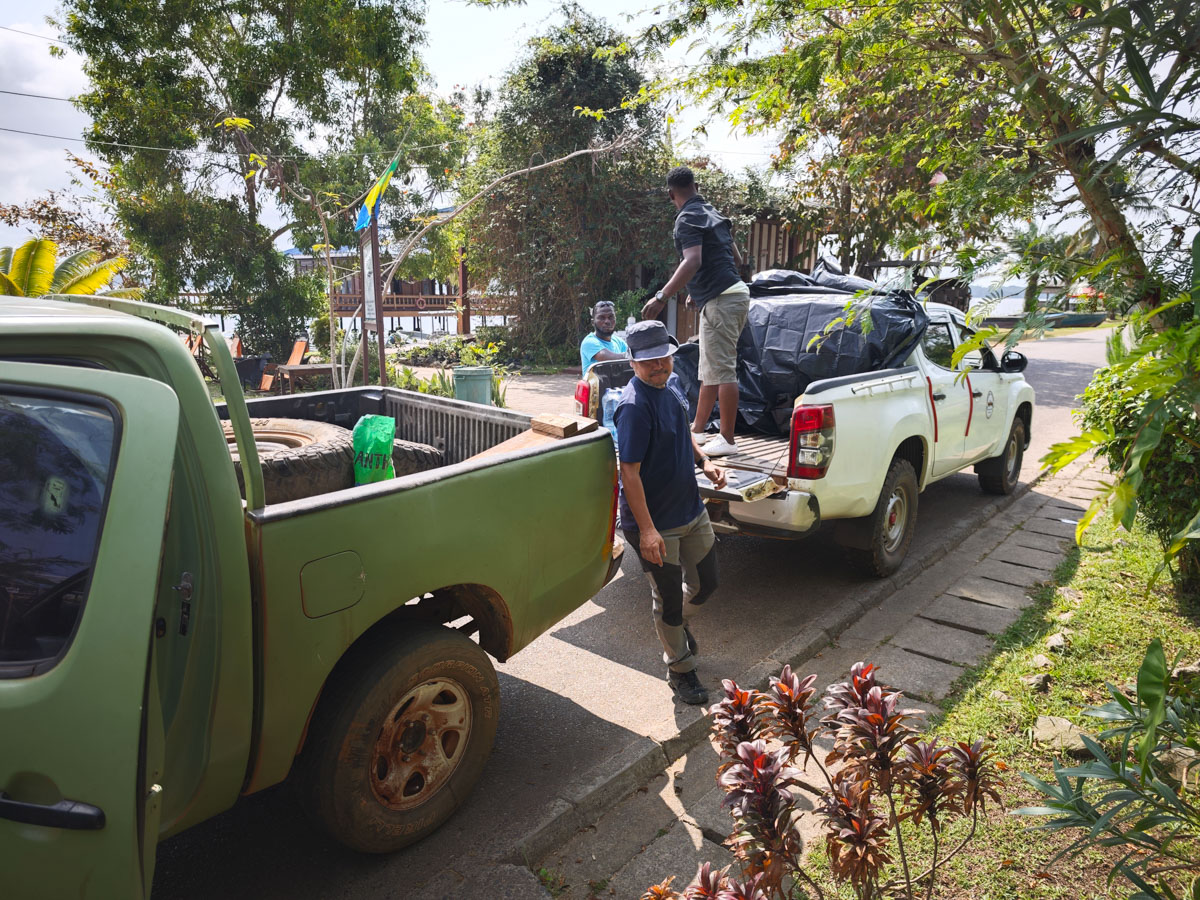 ロペ2.5泊(明け方着だったので)の後は、移動です。まずは赤い土の道路をランクルで走ります。それも改造ランクルで、前向きの座席ではなく軍隊の様に向い合せ横向きで座る席です。座席よりも、かたくなにエアコンを入れないドライバーと土埃に悩まされました。マスクをつけていても鼻の中が赤くなりました。3時間程度走り、途中の街でランチ。そこからは、舗装道路で3時間。この舗装道路が曲者で、舗装しているにもかかわらず穴だらけで、まっすぐ走れない。ランチ後は別のドライバーだったのですが、このドライバーがこの穴ぼこをスピードを緩めずハンドリングで回避する。上手いのですが、狭い車に乗っている私たちにはなかなかきつい運転でした。私は酔いました。夕方には無事ランバレネに着き、シュバイツァー博士の記念館の見学をしました。貴重な展示物がたくさんありましたが、保存状態が良くないものもあり、今後の保存活動も必要かと感じました。できれば英語の解説もあると良いと思いました。ランバレネのホテルは広くて快適でした。