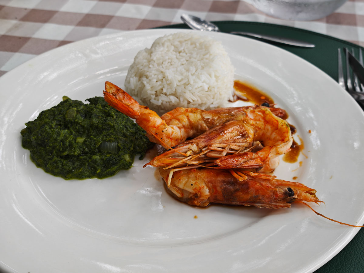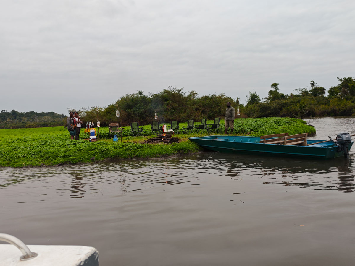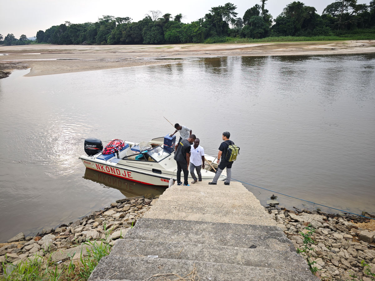 落ち着いて読書をしたり、散歩したり。私たちは鳥を追いかけたり、隣の教会の讃美歌がだんだんとパーカッションが入ってアフリカンゴスペルに変化する様子を聞いたりして時間を過ごしました。1時間は遅れたでしょうか。2台の上等なピックアップトラックでロアンゴに向かいました。途中まで舗装道路、そこからオフロードで揺られ振られてンドラロッヂに渡る船着きがある村まで行きました。そこからボートで国立公園の事務所に行き、入園手続きをして船でンドラのロッヂに向かいました。「ロアンゴはちゃんとしてます」という佐藤さんの言葉通り、ンドラロッヂは立派で、そこでのランチもおいしかったです。