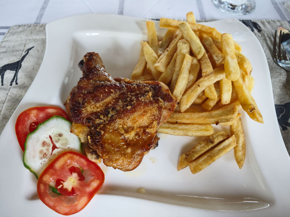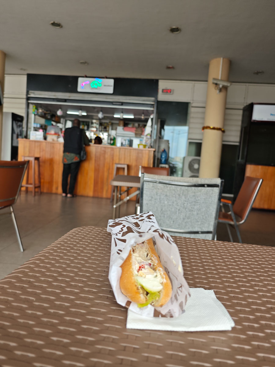 ガボンは一日中湿度が高く、早朝のアカカロッヂのテラスから見える景色は霧につつまれます。時間が進むにつれて少しずつ遠くまで見えるようになってきます。ロアンゴ出発の日は、朝が早く、薄く霧がかかる中をボートで移動しました。赤道直下というのに、風が冷たかったです。公園事務所までボートに乗って2時間程度で移動し、ロッヂのスタッフとはお別れです。ここからはオンブエを抜けてポート・ジェンティまで車移動です。オンブエの近くから舗装道路になりましたが、オンブエを抜けてしばらくすると幹線道路が工事中となり、また赤土のがたがた道になりました。ポート・ジェンティは油田近くの商業都市の様で、空港も設備が整っているようでした。昼食はカフェスタンドのサンドイッチでした。旧フランス植民地あるあるですが、パンがおいしい。結構なボリュームでしたが食べきることができました。空港外側のオープンなカフェで安心してランチがとれるというだけで、ガボンの治安の良さが分かります。ただ、トイレは、便座がなかったり、使えない個室もあったりと、なかなか一筋縄ではいきません。フライトはあっという間で、無事リーブルビルに到着。入国時と同じホテルに宿泊しました。