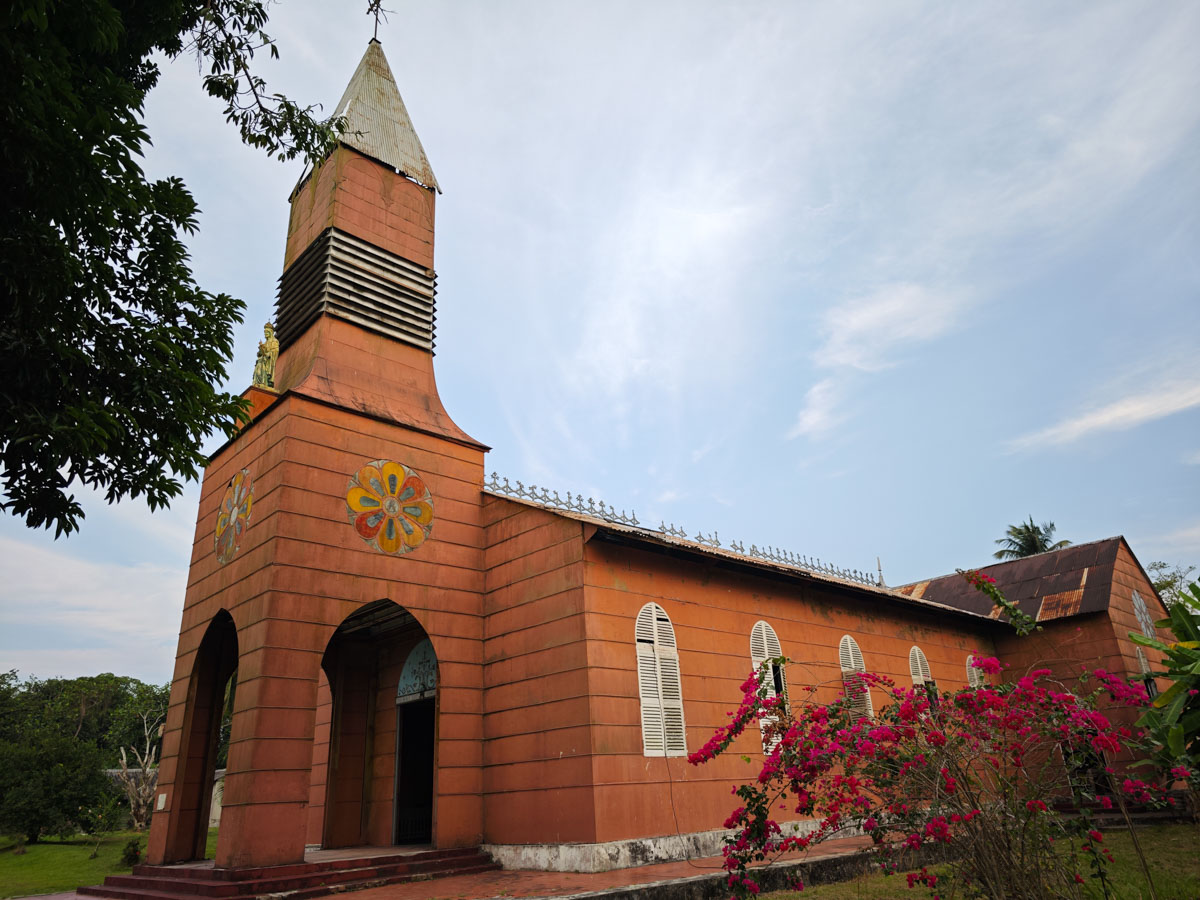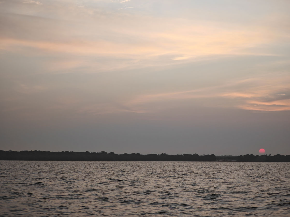 オンブエに着き、船着き場の目の前のホテルにチェックイン。スイートの広い部屋で、連泊しても良いかと思うような部屋でした。ただ、食事が出てくるのがのんびりとしていて、結構待たされることが多かったです。これもアフリカ時間。ただ、食事の質は良く、おいしく食べられました。ロアンゴへの移動は明日なので、この日の午後は近くのゴリラ保護施設やエッフェル設計のサン・アン教会(このような辺鄙なところに、エッフェルの設計した教会があるというのも、もとフランス領というところでしょうか)をボートで訪問しました。ゴリラの保護施設は、現在新たなプログラムを検討中だということで、今回はその新しいプログラムを体験させてもらいました。現在直径3kmほどの島に8頭のゴリラを自然に近い形で保護しており、その島のゴリラを船の上から見学するというプログラムです。事前の案内では、島に上陸し施設内、檻越しにゴリラを見学する予定でしたが、船で待機しゴリラが岸に出てくるのを待ちます。あらかじめ、別のスタッフがゴリラをできる範囲で誘導し、ゴリラが見えるようにしていました。今回は、立派なオスのゴリラ1頭が水辺に出てきました。保護施設とはいえ、檻に閉じ込められていないゴリラが海に入ってくる姿は、なかなか不思議な感じがしました。これはこれで、興味深い体験でした。話によると、ここを運営している団体は、密猟にあったゴリラを保護しているそうですが、現地の市場では信じられないくらいの安値で取引されているようです。ローランドゴリラも、レッドリストの「深刻な危機CR」に当たるので、保護施設とはいえ自然に近い形で会うことができて良かったと思います。その後、船でサン・アン教会のある島へ行き見学をしました。エッフェル塔のギュスターブ・エッフェルさん設計だそうです。鉄骨に鉄板をリベット留めした教会は世界中探してもあまりないと思います。補修ができていない箇所があったのでもったいないと思いました。フランスで設計し、フランスで部品を作り現地に送って組み立てたそうです。なかなか行ける場所ではないですが、建築好きにもお勧めの教会です。ホテルに戻る途中、ボートが何度か故障し、ラグーンの上でとうとう本格的に修理する状態に。波に揺られながら少しずつ染まっていく夕方の空を眺めていました。青空に生える白い雲がだんだんと赤く染まっていくのを皆で眺めて過ごしました。これはこれで素敵でした。修理にそこそこ時間がかかりましたが、サンセット直後にはホテルに戻ることができました。