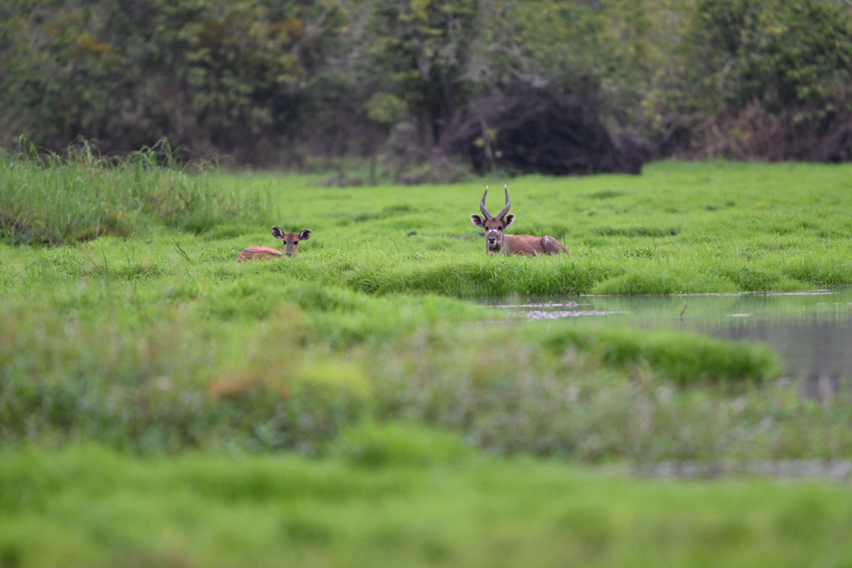 ロアンゴは、マルミミゾウは本当に近い距離でたくさんの個体と遭遇することができる場所でした。テントのデッキからもマルミミゾウが食事をしている姿を眺めることができました。夜はロッヂのある島にもマルミミゾウが来るそうですし、一度メインロッヂのデッキで居ながらサファリをしていた時、デッキの近くの入り江から水に入っていき渡河をするゾウを見ることができました。